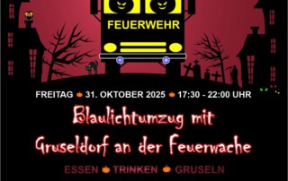 Am Freitag den 31. Oktober 2025 ab 17:30 – 22:00 Uhr veranstalten wir einen Blaulichtumzug mit Gruseldorf an der Feuerwache. Der Schwimmbadparkplatz wird zum Spukplatz! Taucht ein in eine schaurig-schöne Welt voller Nebel, Kürbisse und Geisterklänge! Unser Parkplatz verwandelt sich in ein kleines Halloween-Gruseldorf, das Groß und Klein das Fürchten (und Lachen!) lehren wird. Süßes oder Saures für die Kinder Gruselige Platzkonzerte vom Spielmannszug Essen & Getränke für alle mutigen Besucher Dekoration, die selbst Geister staunen lässt Wir öffnen das Gruseldorf um 17:30 Uhr und starten mit dem Blaulichtumzug durch Brühl und Rohrhof, auf dem unten aufgeführten Zugwege.Nach dem Umzug [...]