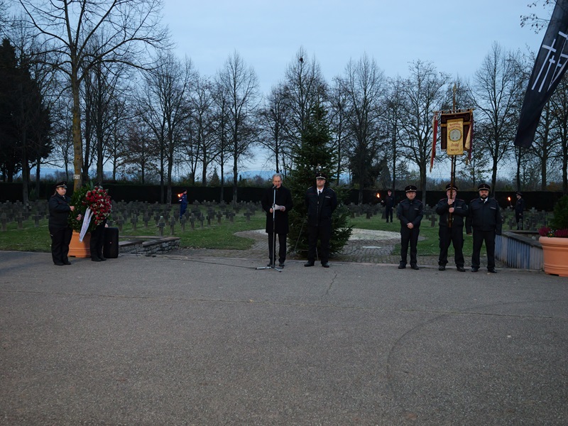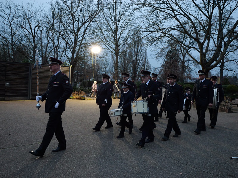 Begleitet vom Klang des Spielmannszugs zogen die Feuerwehrangehörigen mit Standarten- und Fackelträgern in den Friedhof ein. In stillem Gedenken wurde ein Kranz niedergelegt. In einer kurzen Ansprache erinnerten Bürgermeister Dr. Ralf Göck und Kommandant Marco Krupp daran, dass ihr Engagement und ihre Hilfsbereitschaft bis heute nachwirken.