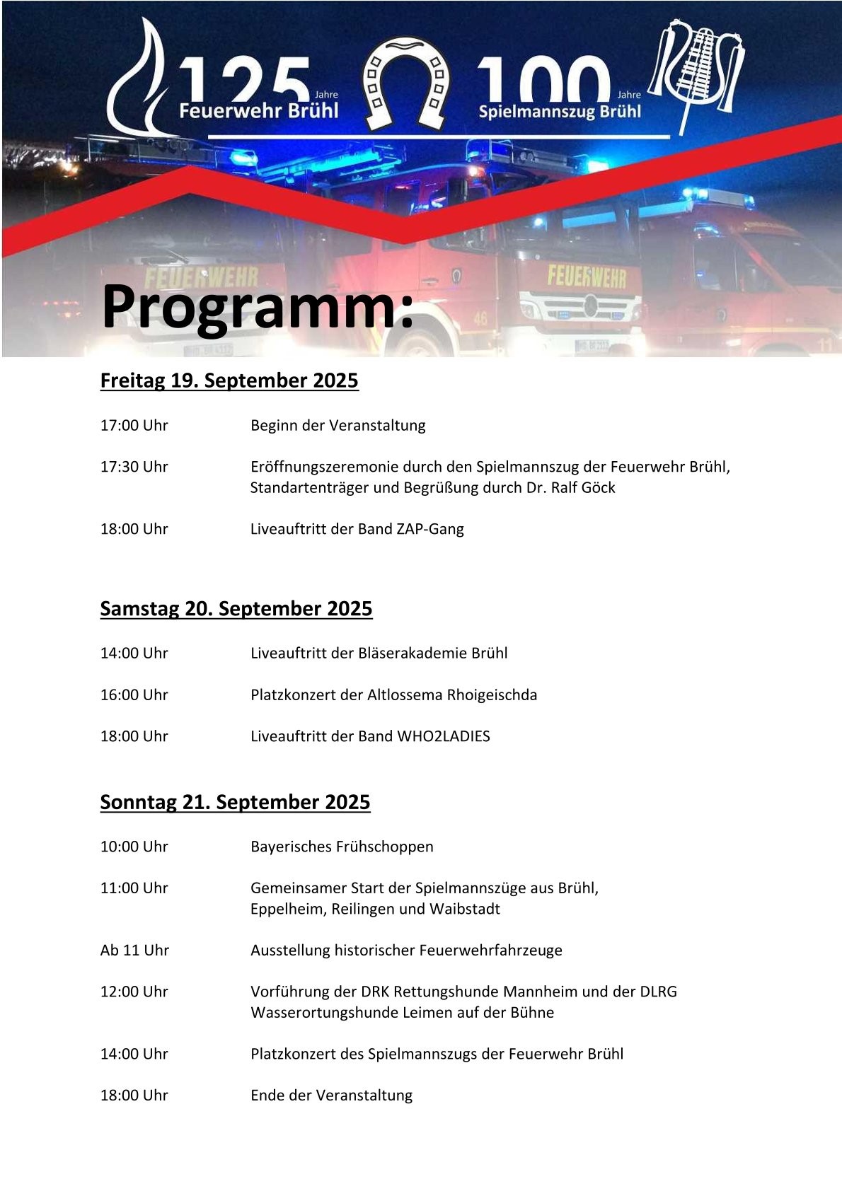 Los geht es am Freitag um 17 Uhr. Ab 18 Uhr rockt die ZAP-Gang die Bühne. Das Repertoire der sechs Musiker besteht aus modernen Hits und alten Klassikern. Weiter geht es einen Tag später um 14 Uhr. Partystimmung ist dann mit den Who2Ladies ab 18 Uhr angesagt. Mit Rock, Pop und Partyschlager bringen sie das Publikum garantiert zum Tanzen. Sonntagvormittags tischt der Förderverein der Freiwilligen Feuerwehr Brühl zum Frühschoppen ein Weißwurstfrühstück auf. Zwischen 10 und 18 Uhr laden außerdem Spielmannszüge – darunter natürlich auch der Brühler Musikzug – mit Platzkonzerten zum Zuhören und Genießen ein.